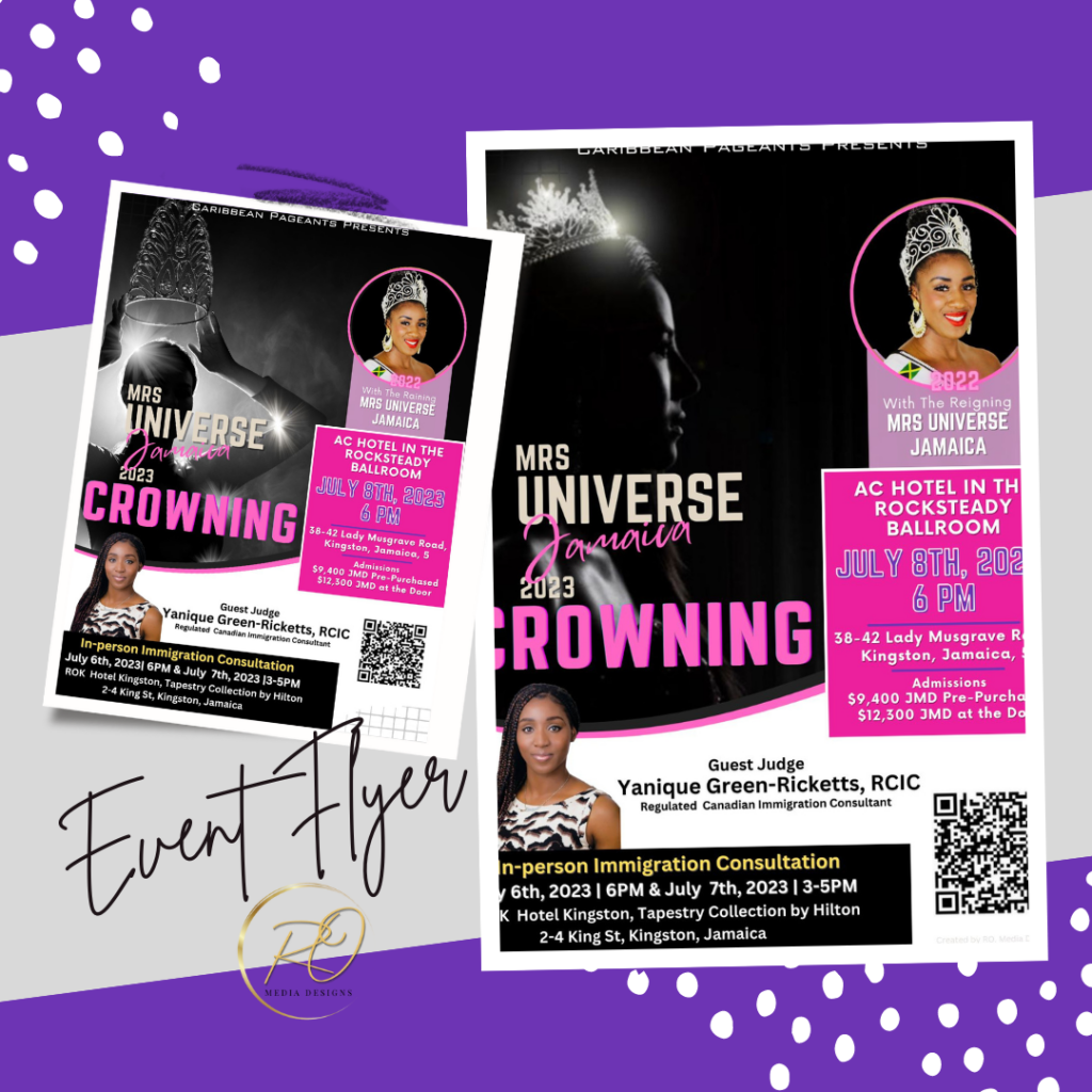 Promotional flyer redesign for the Mrs. Universe Jamaica 2023 Crowning Ceremony, featuring a dramatic pageant-inspired concept and refined layout to highlight key event details.