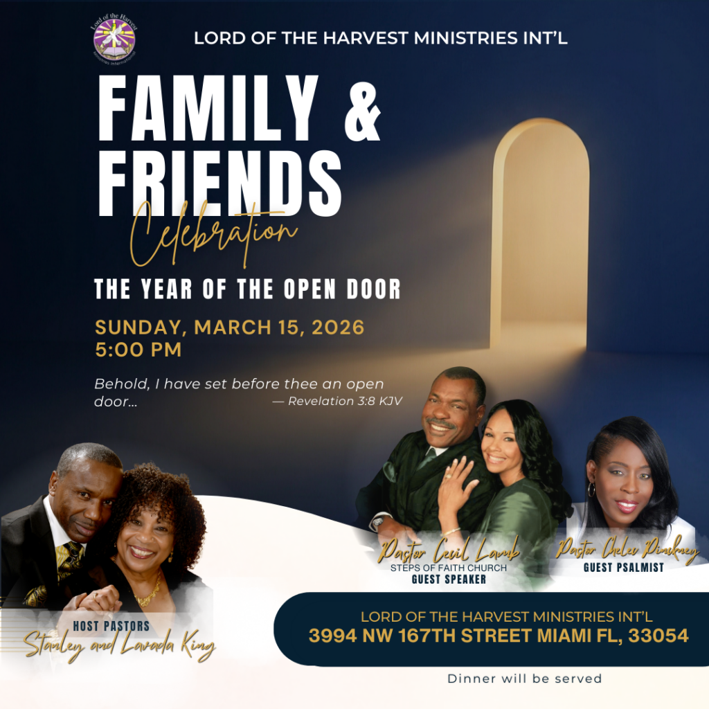 Event flyer design for Lord of the Harvest Ministries Int’l’s 2026 Family & Friends Celebration, combining strong visual hierarchy with a theme centered on “The Year of the Open Door.”