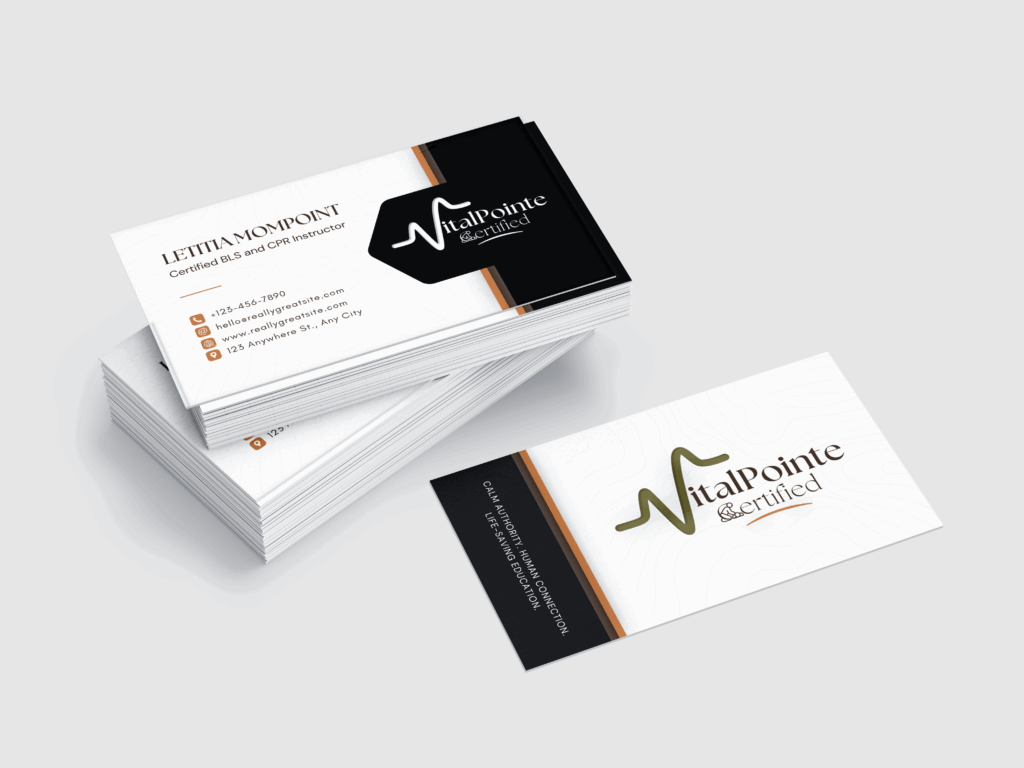 Brand identity and business card design for VitalPointe Certified, combining clear visual hierarchy and professional styling to communicate trust and credibility for a CPR & BLS training business.
